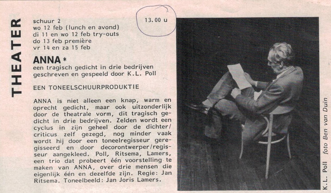 ‘ANNA is niet alleen een knap, warm en oprecht gedicht, maar ook uitzonderlijk door de theatrale vorm, dit tragisch gedicht in drie bedrijven. Zelden wordt een cyclus in zijn geheel door de dichter/criticus zelf gezegd, nog minder vaak wordt hij door een toneelregisseur geregisseerd en door een decorontwerper/regisseur aangekleed. Poll, Ritsema, Lamers, een trio dat probeert één voorstelling te maken van ANNA, over drie mensen die eigenlijk één en dezelfde zijn.’